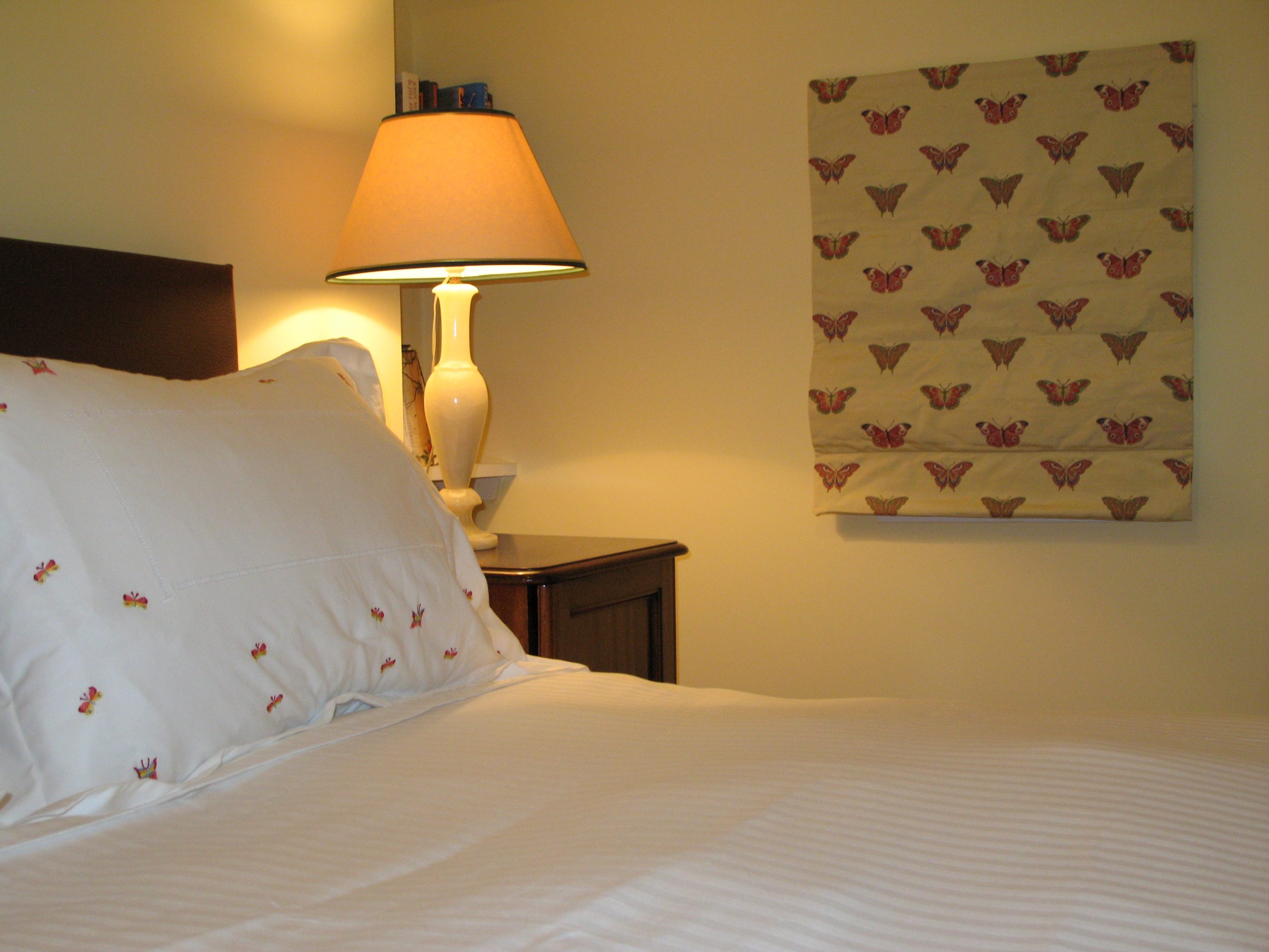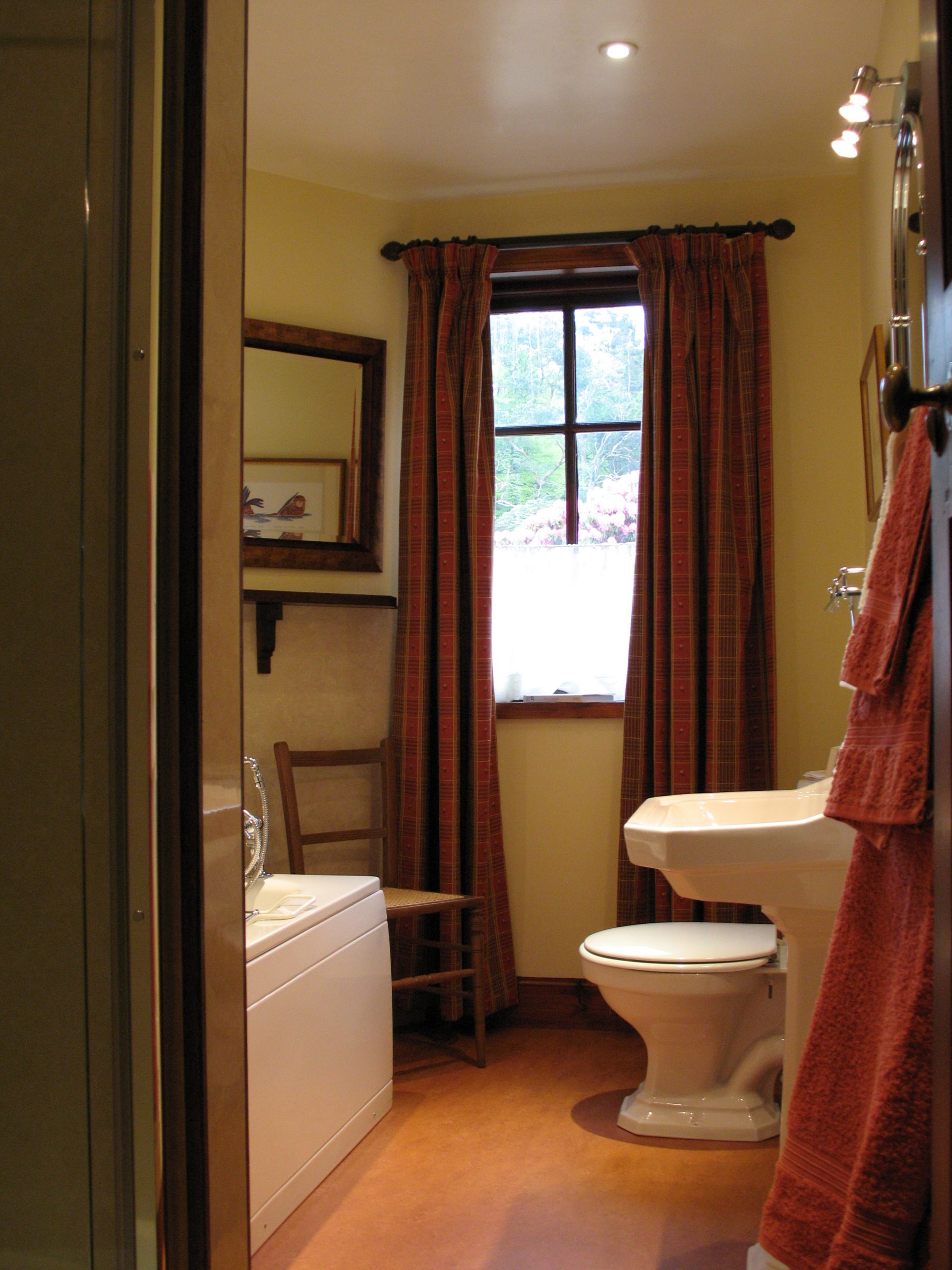 The two bedrooms can either be super-kings or single beds – big and comfy for a good night’s sleep, with at least 250 thread count 100% cotton bedlinen and beautifully hand embroidered pillowcases. Pillows and duvets are 100% British Wool from The Wool Room, traceable back to the farm they came from, allergy friendly and wonderfully comforting – warm in winter and cool in summer – bliss! The curtains are interlined as well, so keep you extra cosy in winter. Each bedroom has a bathroom across the passage. The master bedroom has the larger bathroom with a separate shower. The other has a shower over the bath. Flooring is allergy friendly and there are plenty of sumptuous towels.